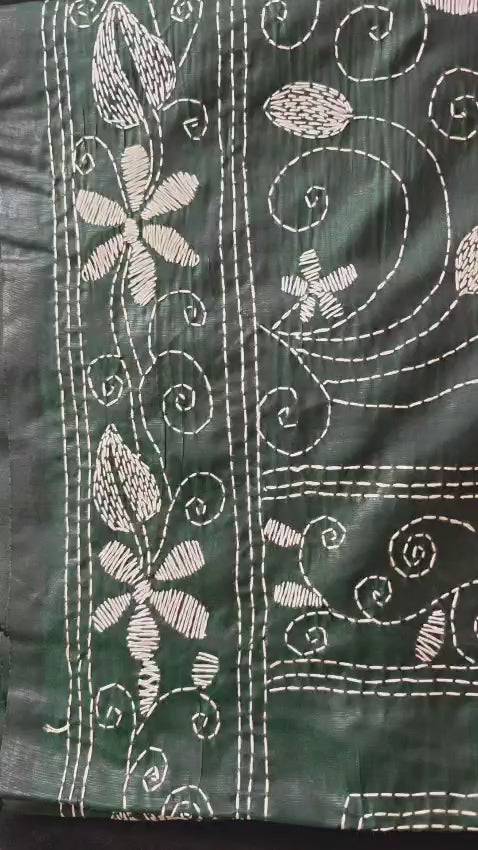 Bottle Green Kantha Murshidabad Silk Saree